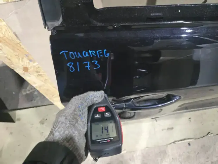 - Толщина лакокрасочного покрытия (ЛКП). Замер производится в пяти точках. Допустимый диапазон для оригинального заводского слоя — 110-135 микрон. Значительные отклонения говорят о перекрасе.